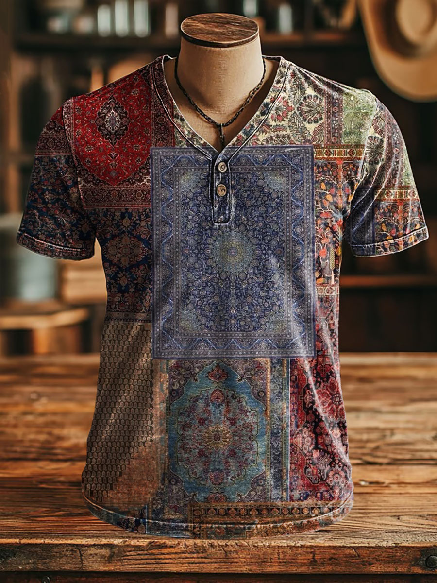 Ethnic style patterns Patchwork Vintage Print Casual Cotton Henry Collar Tshirt