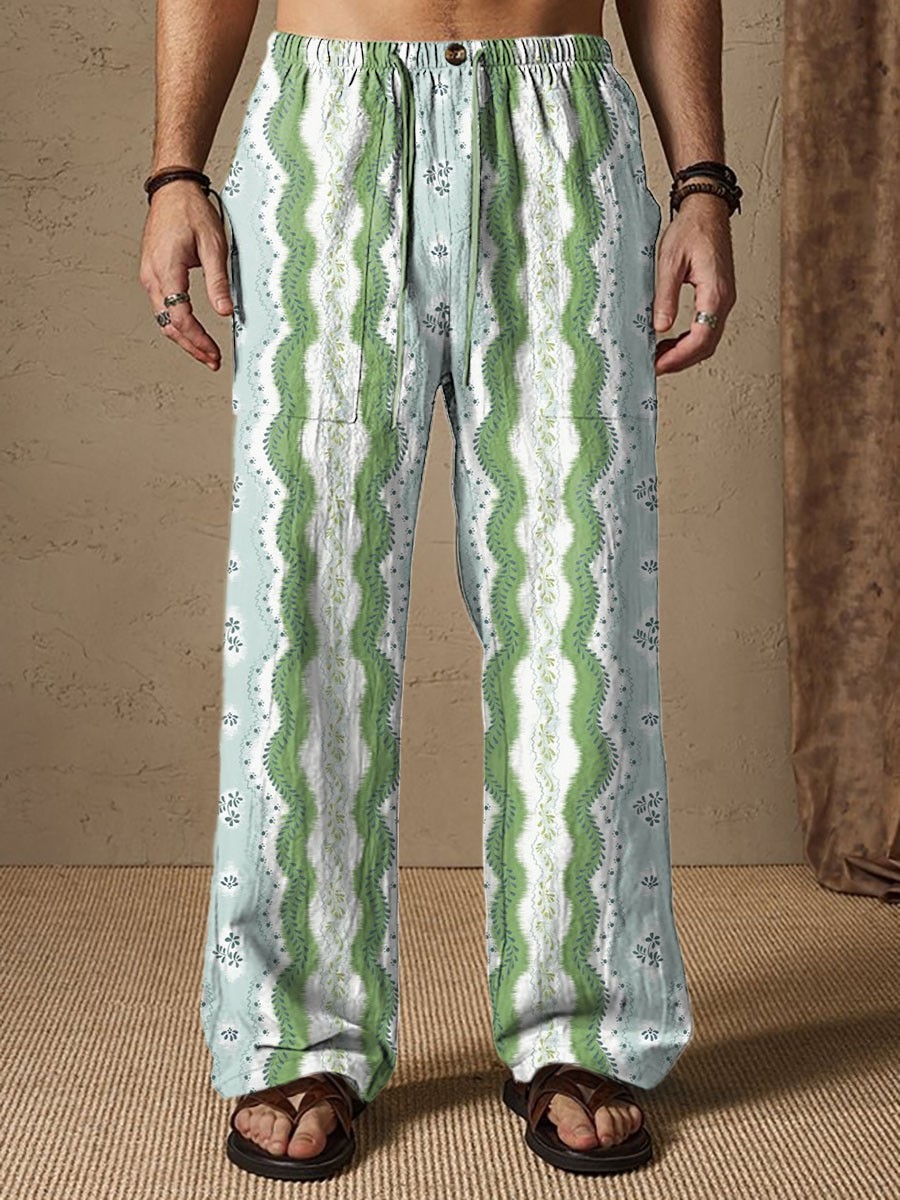 Green Ethnic style Floral Pattern Men's Comfy 100% Cotton Pants