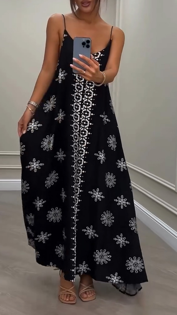Step into a world of free - spirited charm with this black printed maxi dress—a seamless blend of bohemian patterns, flowing silhouettes, and effortless elegance for your most memorable moments.
