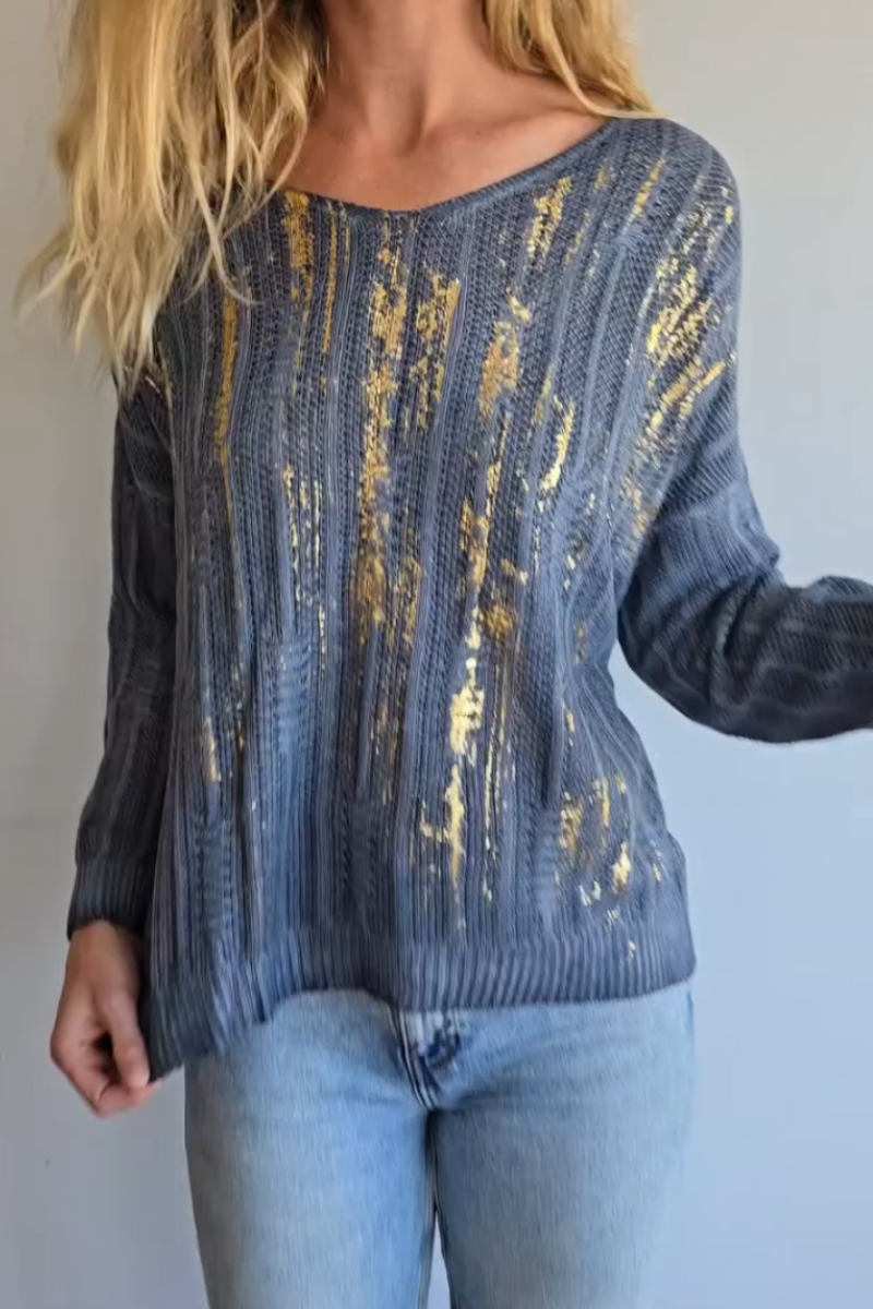 This sweater boasts a rich blue hue that serves as a sophisticated backdrop for the eye - catching gold foil details. The intricate knit pattern adds texture, while the gold accents create a shimmering, artful effect, making it feel like you’re wrapped in a piece of wearable luxury. The boat neckline offers a flattering, feminine touch, perfect for showcasing delicate necklaces or simply letting the sweater’s design take center stage. It’s ideal for adding a touch of glamour to casual days or elevating evening looks.
