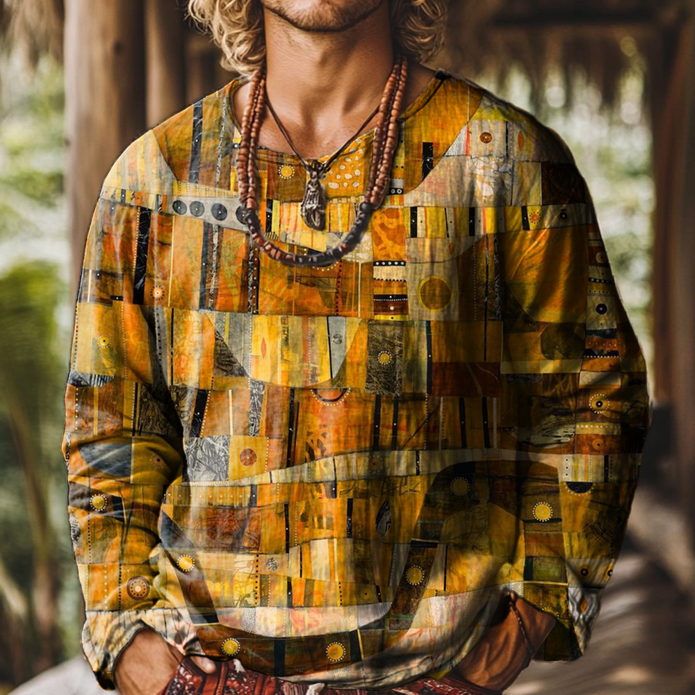 Men's Art Painting Ethnic Style Gradient Color Block Retro Print Round Neck Long Sleeve