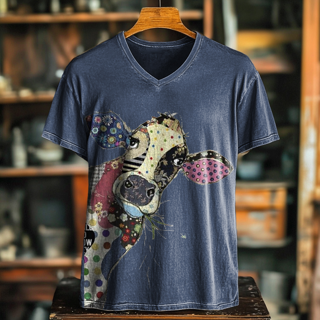 Men's Art Painting Farm Fun Animals Patchwork Print V-Neck Short Sleeve