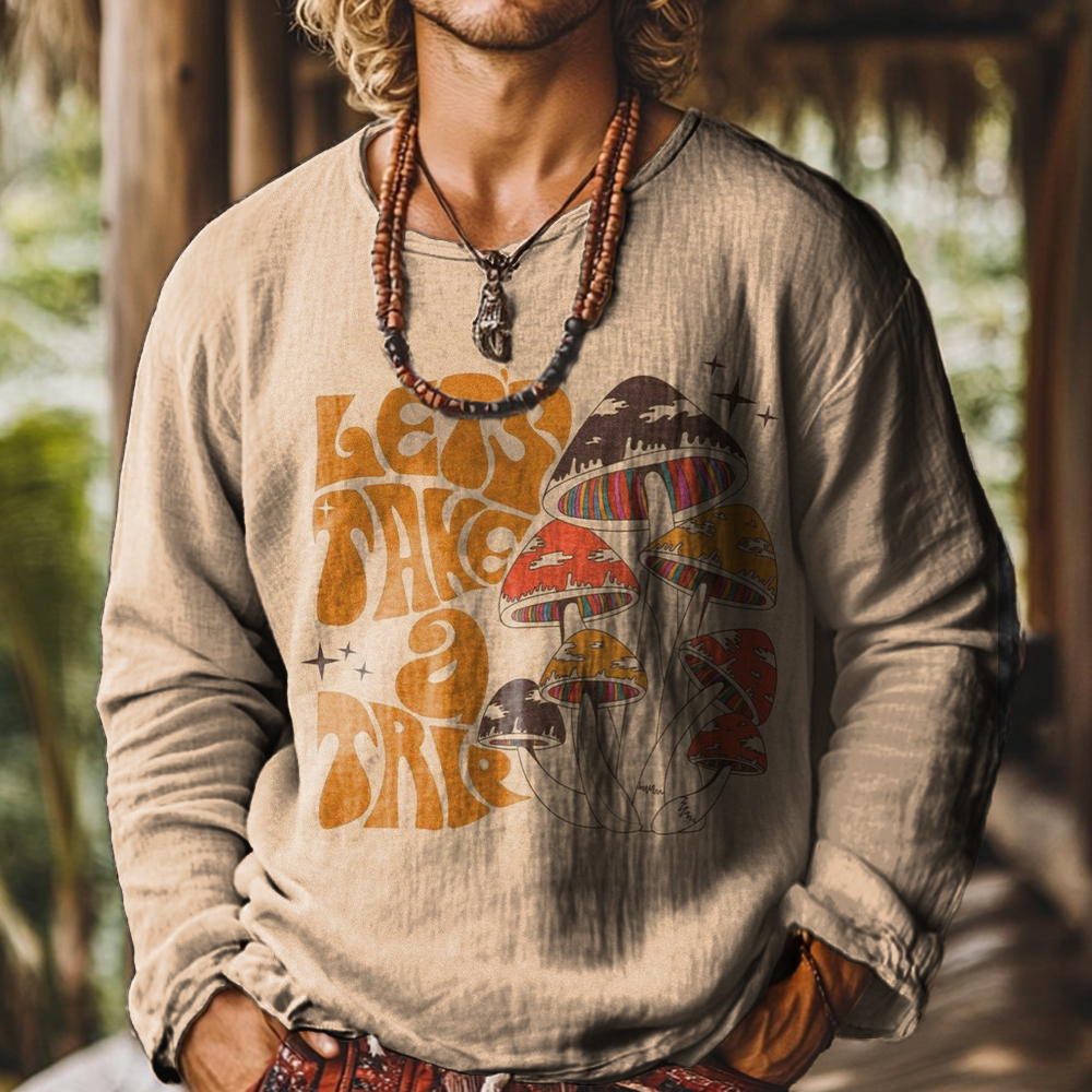 Men's Art Painting Hippie Rainbow Mushroom Letters Graffiti Print Round Neck Long Sleeve