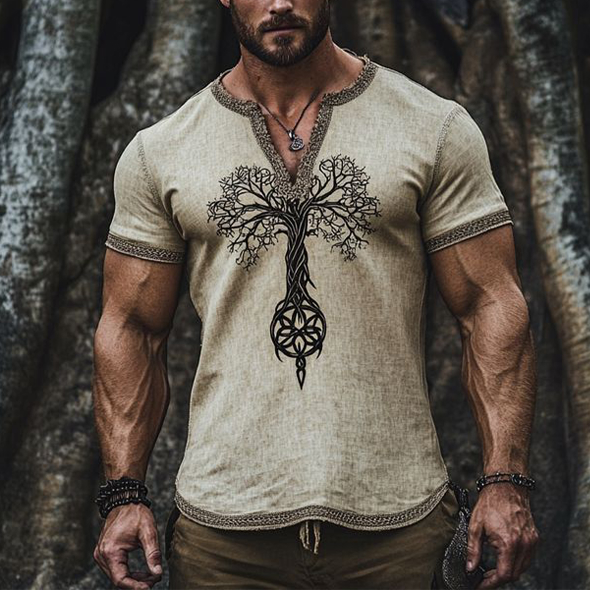 Men's Art Painting Tree of Life Vintage Print V-Neck Short Sleeve