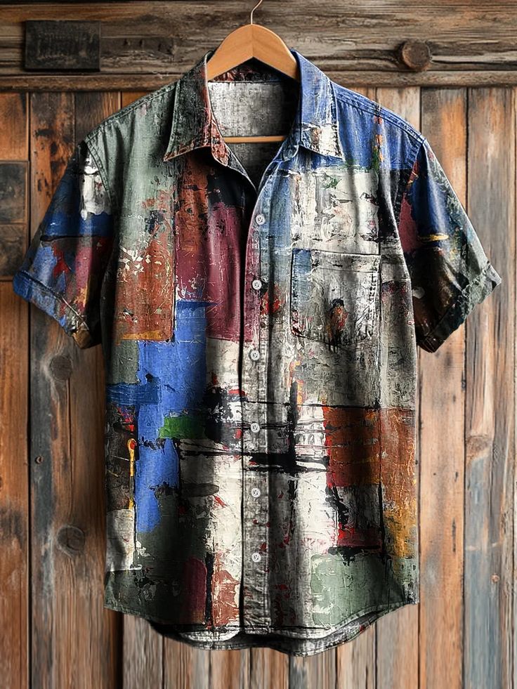 Men's Retro Abstract Colorful Art Print Short Sleeve Pocket Shirt