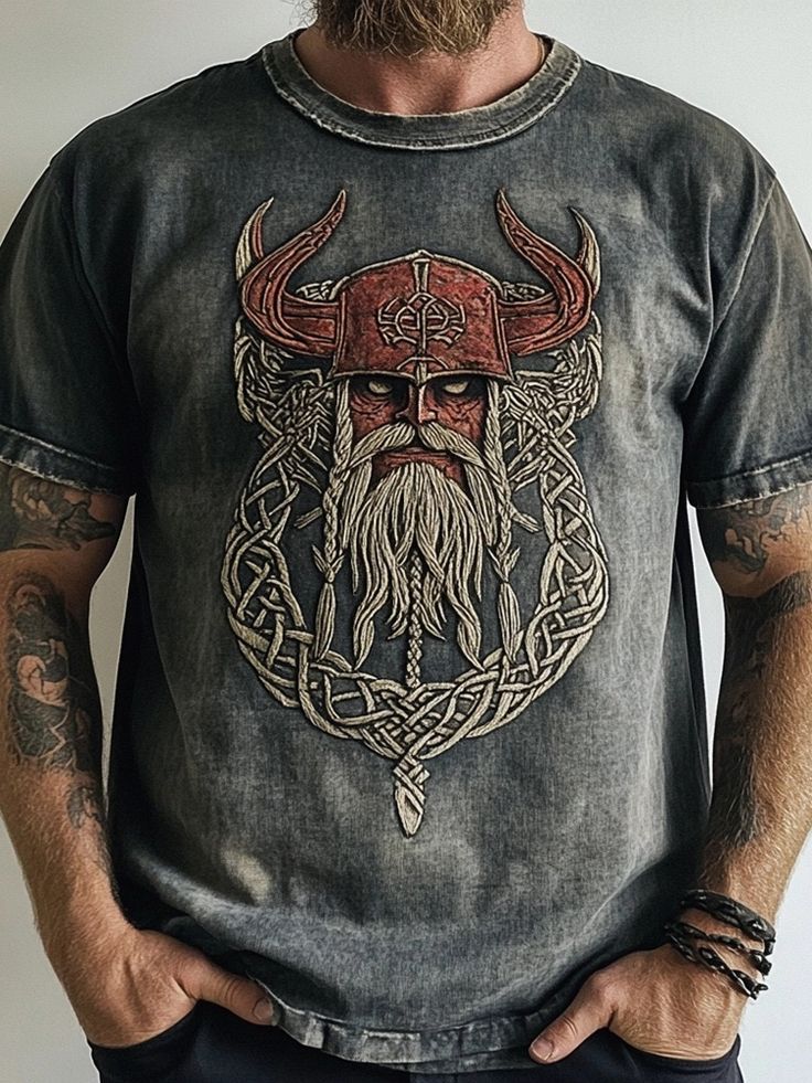 Men's Viking Celtic Knot Embroidery Vintage Print Crew Neck T-Shirt