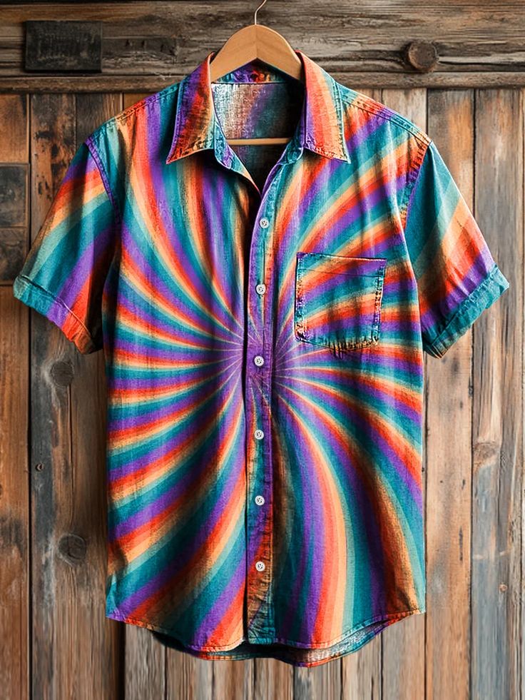 Men's Vintage Colorful Spiral Art Print Short Sleeve Pocket Shirt