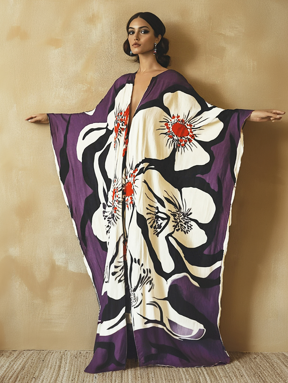 Purple Art Flower V-neck Kaftan Maxi Dress