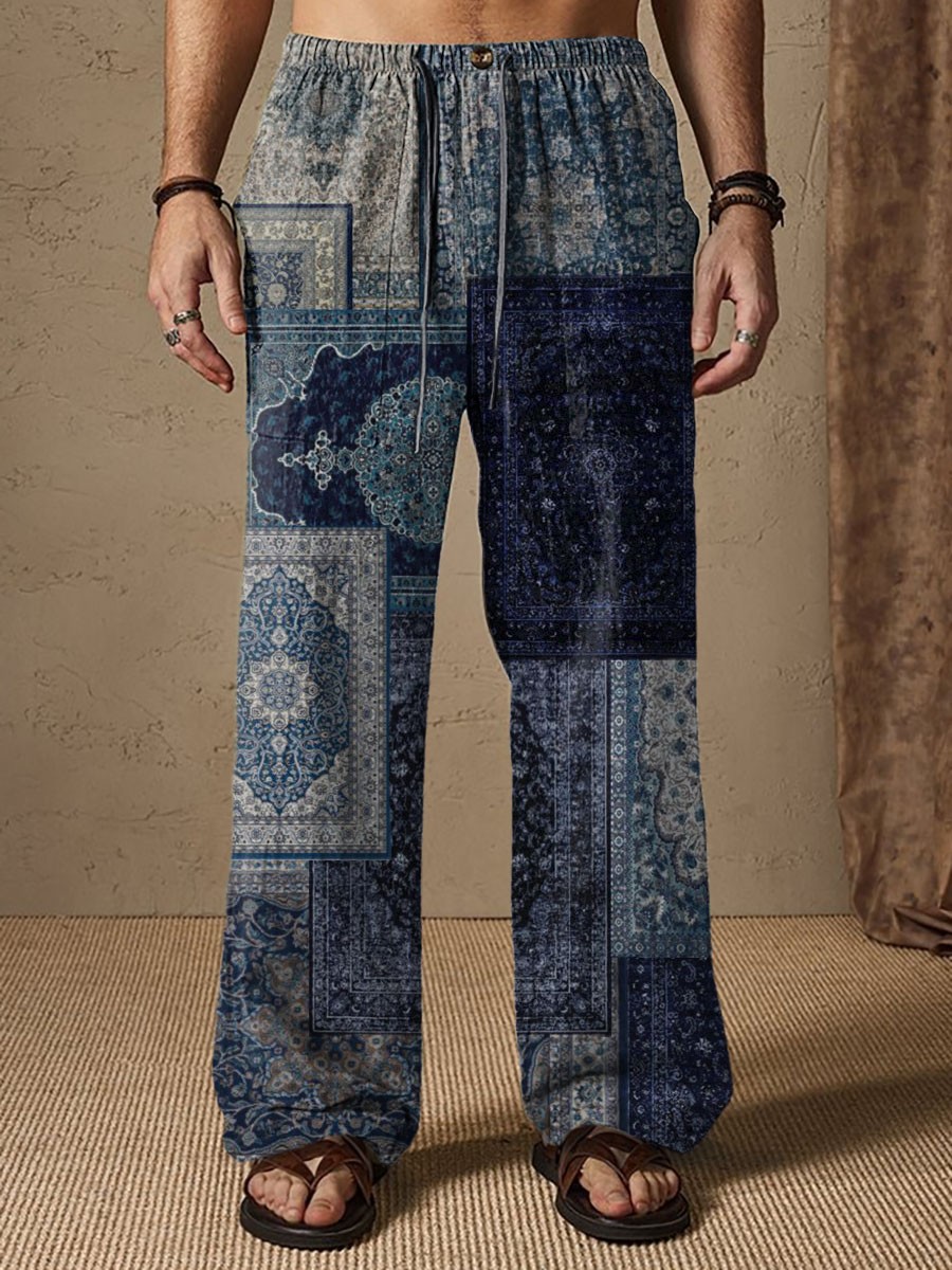 Retro Blue National flower Pattern Patchwork Men's Comfy 100% Cotton Pants