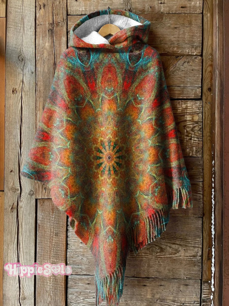Retro Ethnic Totem Pattern Love and Peace Print Casual Knitted Blanket Poncho Hood Cape