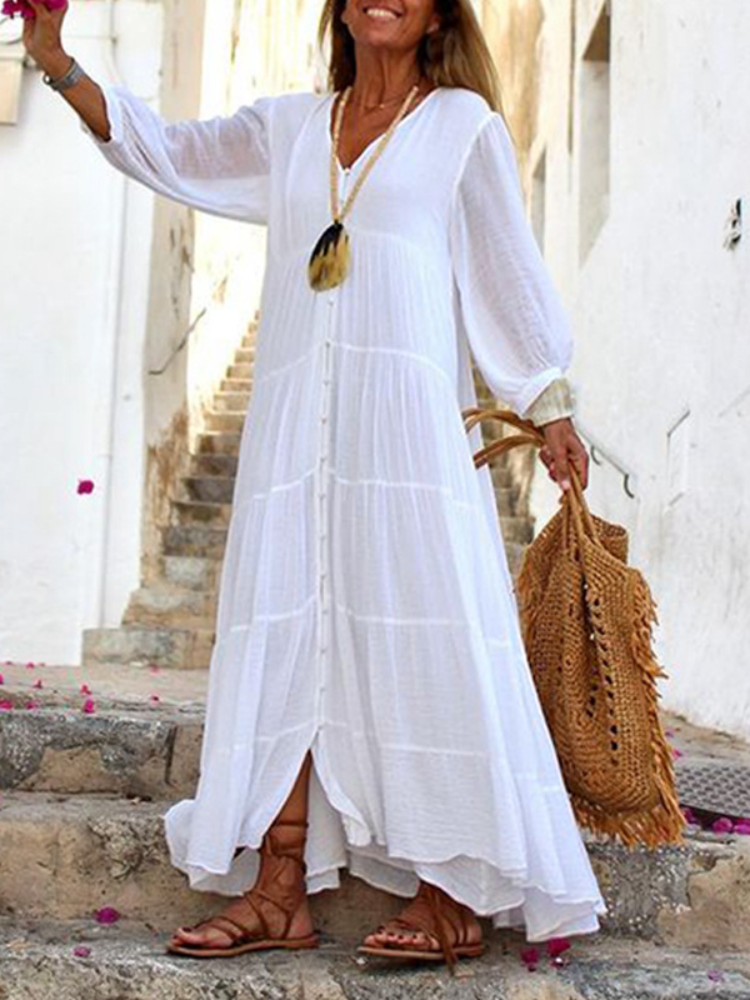 Seraphina Cotton Linen Blend Button Up Tiered Maxi Dress