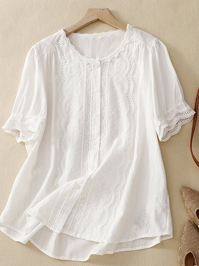 Solid Color Hollow Embroidery Lace Stitching Short-Sleeved Shirt