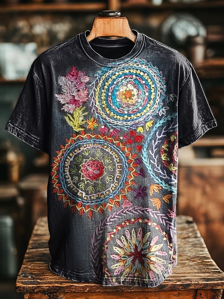 Unisex Vintage Abstract Patch Floral Print Casual Loose T-Shirt