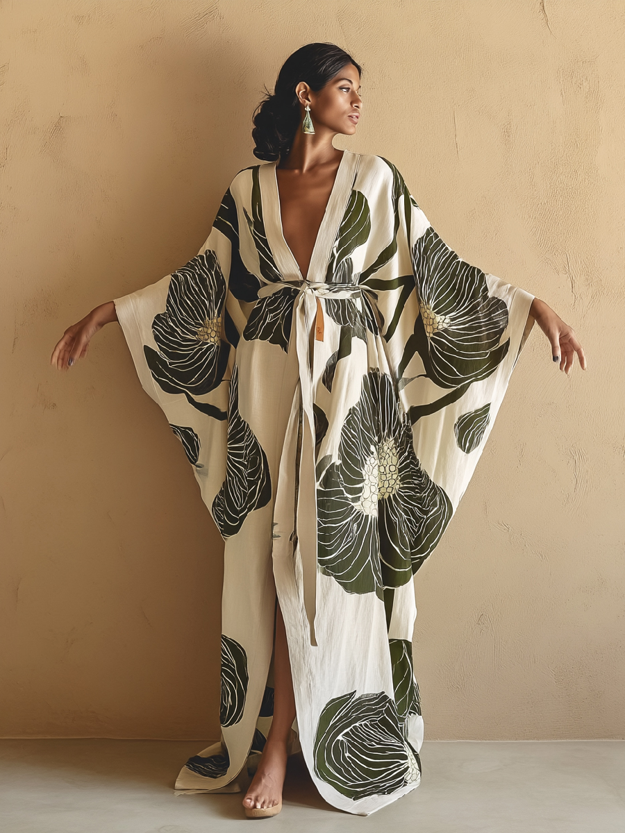 Chic design: The green flower pattern on a white background features traditional kimono-style sleeves and an elegant silhouette with a belt for a flattering fit.