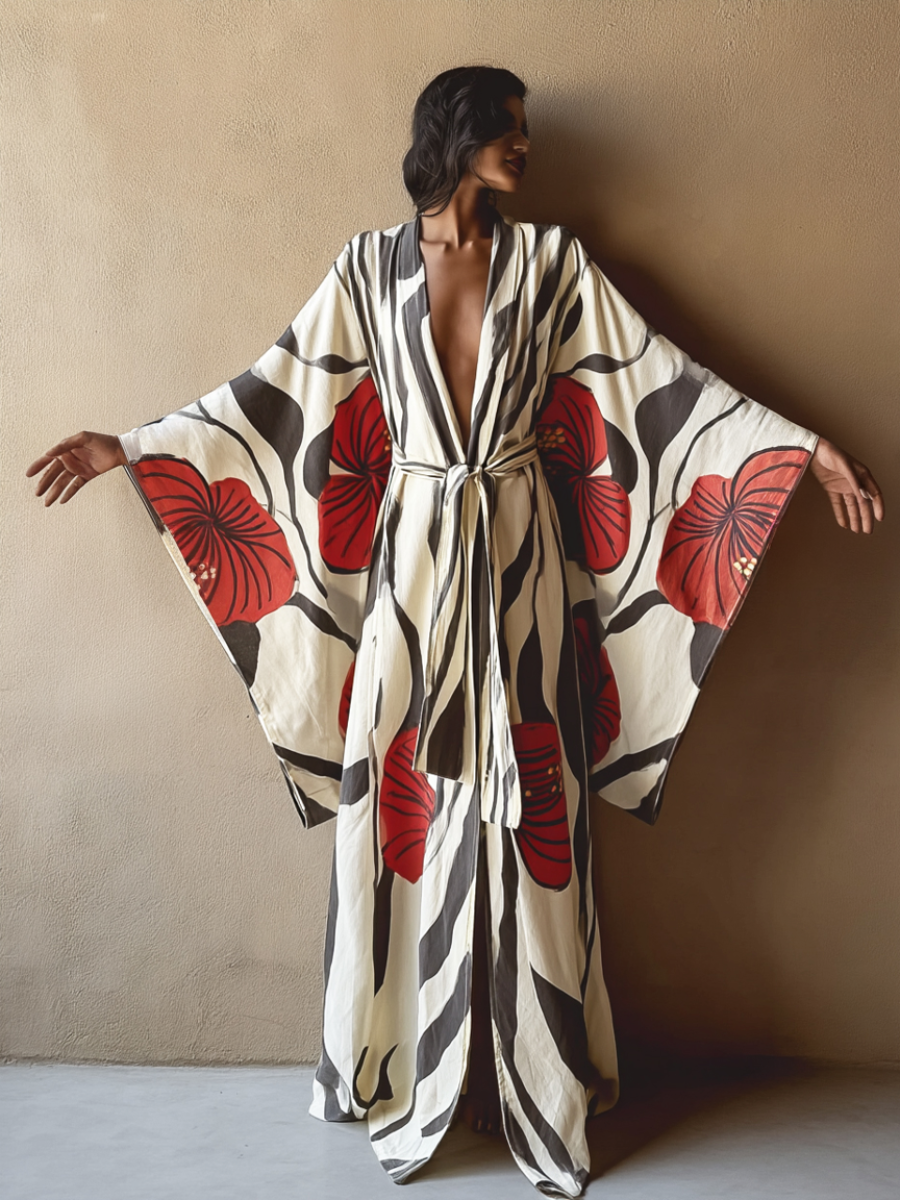 Chic design: The red flower pattern on a white background features traditional kimono-style sleeves and an elegant silhouette with a belt for a flattering fit.