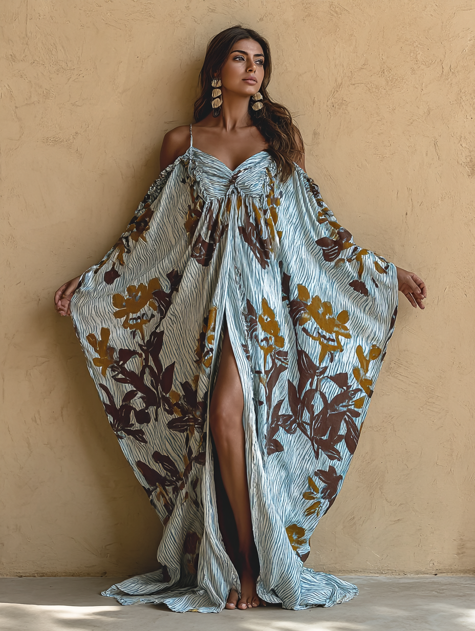 Art Print: A distinctive teal background with a striped art print and a vest-shaped off-the-shoulder front and center slit adds a vibrant bohemian twist to your wardrobe.