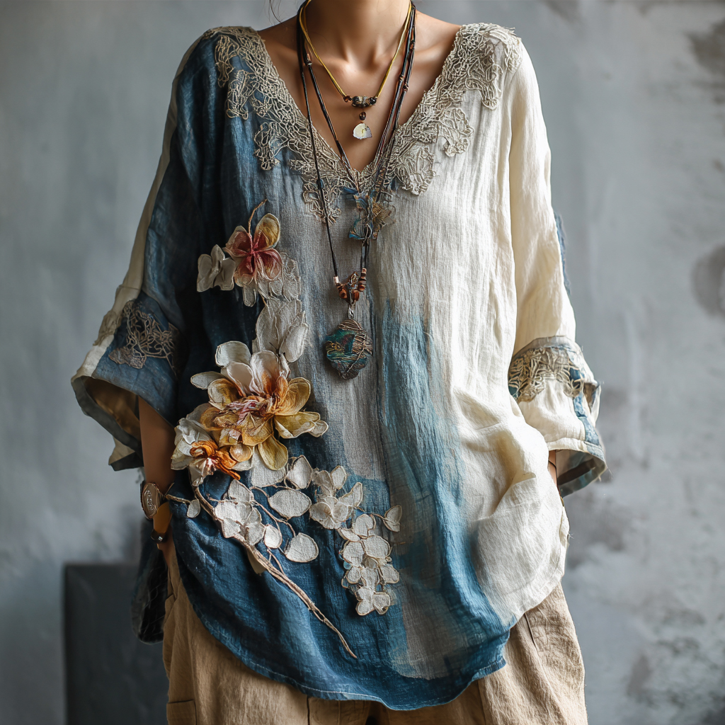 Women's Vintage Oil Painting Floral Art V-neck Shirt
