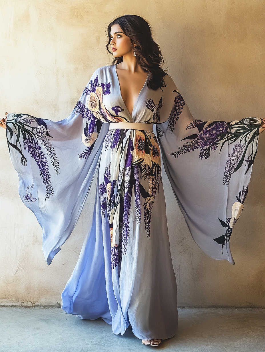 Chic design: Some Wisteria pattern on a purple background features traditional kimono-style sleeves and an elegant silhouette with a belt for a flattering fit.